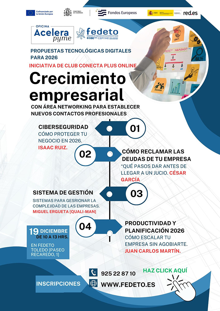 INFORMACIÓN BÁSICA DE PROTECCION DE DATOS Le informamos que sus datos serán tratados por FEDETO CEOE CEPYME TOLEDO - G45024866, con la finalidad de gestionar su inscripción. Usted tiene los derechos de acceso, rectificación, portabilidad, supresión, limitación y oposición al tratamiento, así como el derecho a retirar su consentimiento en cualquier momento. En la política de privacidad de la web puede obtener información ampliada sobre cómo tratamos sus datos, y cómo puede ejercer sus derechos de protección de datos.